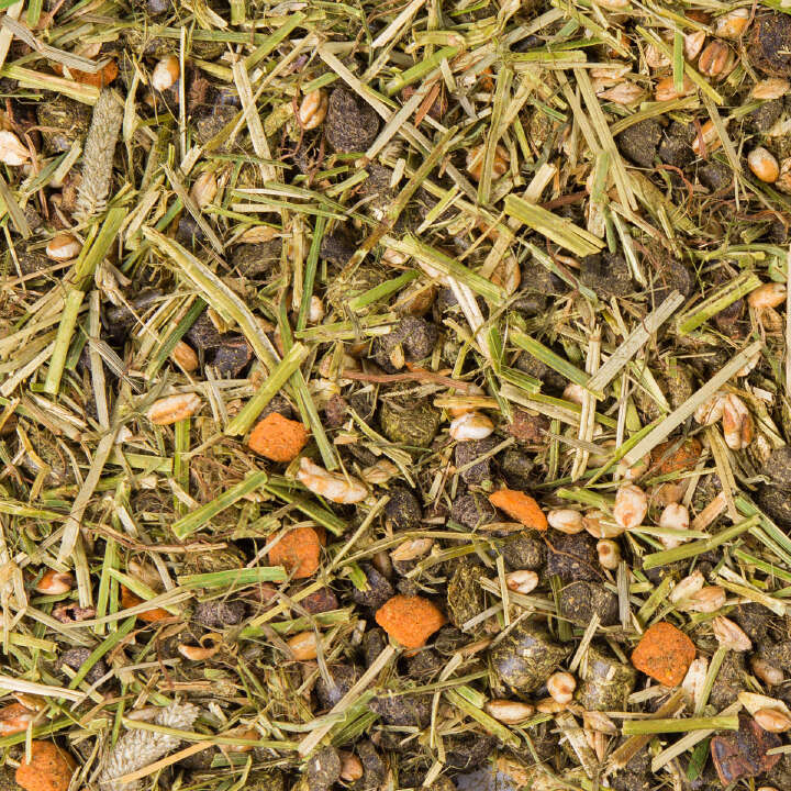 36,5 % Alfalfa, Sonnenblumenschalen, Gerstenflocken, Wiesen-Lieschgras, Sonnenblumenextraktionsschrotfutter, Apfeltrester, Gerste gepufft, Johannisbrotschrot, Mais extrudiert, Sonnenblumenöl, Leinkuchen, Calciumcarbonat, Monocalciumphosphat, Natriumchlorid, Maiskeime, Magnesiumoxid, Rote Beete, Leinöl, 0,5 % Kräuter (Kurkuma, Basilikum, Rosmarinblätter, Fenchelsaat, Minze, Brennnesselblätter)