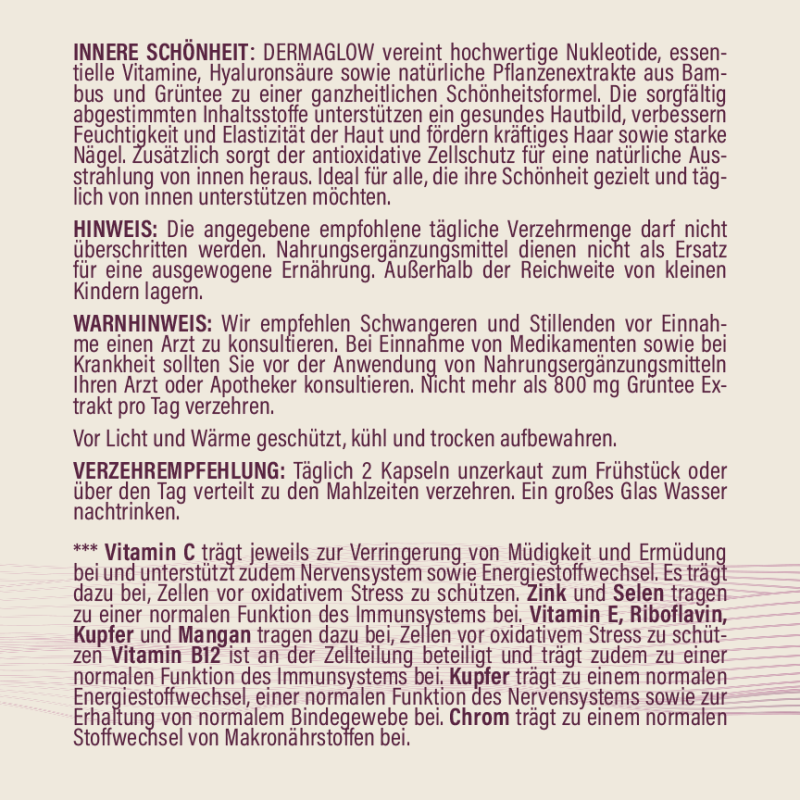 DERMAGLOW vereint hochwertige Nukleotide, essentielle Vitamine, Hyaluronsäure sowie natürliche Pflanzenextrakte aus Bambus und Grüntee zu einer ganzheitlichen Schönheitsformel.