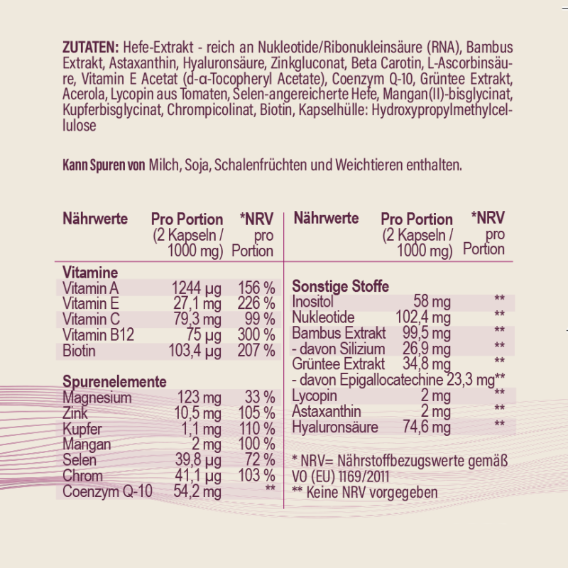 Hefe-Extrakt - reich an Nukleotide/Ribonukleinsäure (RNA), Bambus Extrakt, Astaxanthin, Hyaluronsäure, Zinkgluconat, Beta Carotin, L-Ascorbinsäure, Vitamin E Acetat (d-a-Tocopheryl Acetate), Coenzym Q-10, Grüntee Extrakt, Acerola, Lycopin aus Tomaten, Selen-angereicherte Hefe, Mangan(II)-bisglycinat, Kupferbisglycinat, Chrompicolinat, Biotin, Kapselhülle: Hydroxypropylmethylcellulose